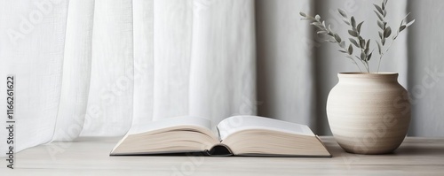 Open book, pottery, linen curtain swaying in breeze, calming desk setup, organic and artistic