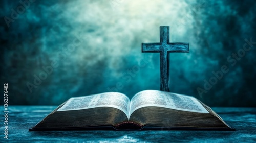 Open book with cross on sunset background. Christian concept.