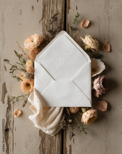 envelope, floral, flower, greeting, invitation, rustic, wood, blank, message, design, stationery, white, neutral, garden, romantic, soft, pastel, botanical, arrangement, vintage, table, surface, elegant, decorative, overhead, nature, composition, styling, closeup