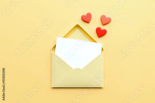 Open envelope with blank letter and two red hearts on pastel yellow background, top view with copy space