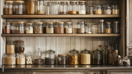 Open kitchen shelving in a farmhouse-style kitchen, elegantly displaying spices in glass jars and storage containers.