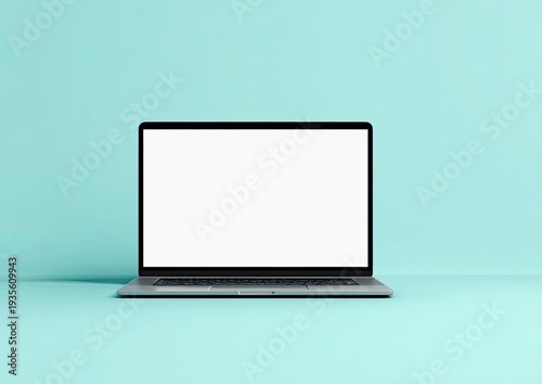 laptop, open, blank, screen, display, technology, computer, modern, device, portable, notebook, electronic, digital, office, work, home, workspace, minimalist, clean, simple, isolated, shadow, background, cyan, teal, blue, green, light, bright, professional, business, study, learning, cyberspace, communication, browsing, connection, network, datum, information, online, virtual, global, project, task, tool, equipment, hardware, appliance