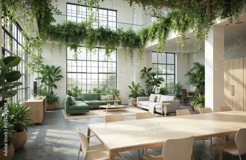 office, plant, interior, sustainable, modern, lounge, furniture, green, white, table, chair, design, architecture, nobody, indoor, floor, apartment, living, contemporary, light, window, workstation, empty, hotel, indoor, creative, room, workspace, area, workplace, glasses, decor, bright, calm, peaceful, ambience, comfortable, style, minimalist, working, sofa, desk, interior design, work, background, corporate, company, lobby