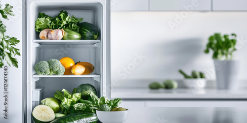 Open refrigerator with healthy food, vegetables and fruits in kitchen interior. Healthy proper nutrition