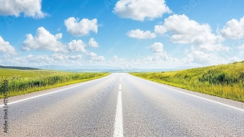 Open Road to Adventure: A vast and inviting road stretches into the distance, beneath a bright blue sky dotted with fluffy clouds, inviting travelers to embark on a journey of discovery.