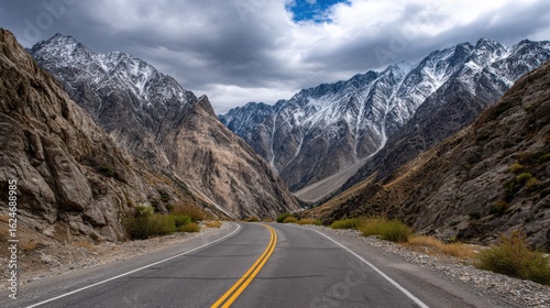 mountain, road, landscape, vale, snow, peak, rocky, slope, cloudy, sky, scenic, travel, nature, wilderness, adventure, highway, asphalt, route, mountainside, rugged, drive, horizon, photo, natural, scenery, range, destination, area, weather, alpine