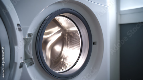 washing machine, open door, drum, interior, light, bright, clean, appliance, household, laundry, home, chore, white, metal, modern, domestic, convenience, technology, hygiene, fresh, empty, automatic, electric, closeup, detail, indoor, kitchen, bathroom, utility room, routine, preparation, maintenance, efficiency, spotless, gleam, shine, futuristic, energy, water, save, eco, cleanliness