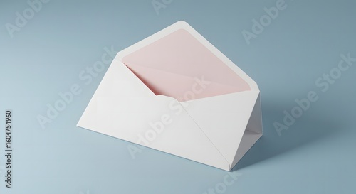 Open white envelope with soft pink paper inside on blue background