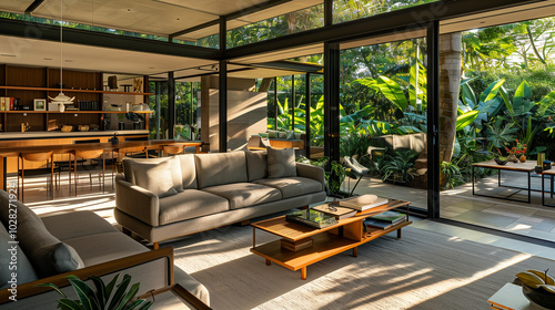 Open-concept living space with a neutral palette, featuring a gray sofa, wooden coffee table, and floor-to-ceiling windows overlooking a lush garden.