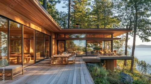 Open-concept wooden house with glass walls, spacious deck, ocean view