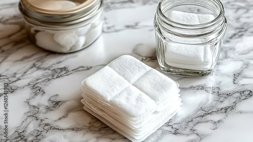 Opened pack of cotton pads lying on a marble countertop beside a glass jar