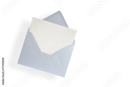 Opened silver envelope with emerging gray card, isolated on white background