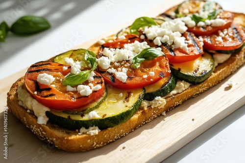 Open-faced sandwich topped with hummus grilled vegetables and feta cheese on wooden board