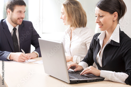 working, concentration, discussion, laptop, computer, business, smiling, people, adult, interview, conversation, speaking, writing, three people, planning, research, male, female, occupation, job, businessman, businesswoman, businessperson, teamwork, listening, partnership, tied-up, cooperation, sitting, talking, suit, communication, asking, creativity, indoor, typing, wireless technology