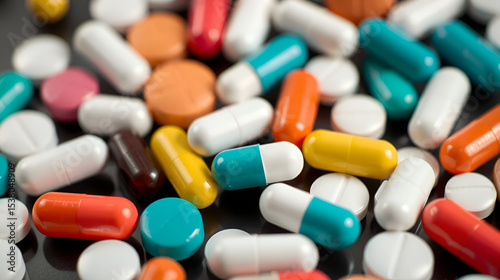 Opioid painkillers crisis and drug abuse concept. Opioid and prescription medication addiction epidemic. Different kinds of multicolored pills. Pharmaceutical medicament background