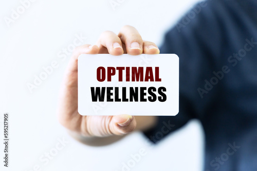 Optimal wellness text on blank business card being held by a woman's hand with blurred background. Business concept about optimal wellness.