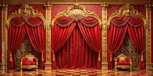 opulent crimson red curtains dramatically unfolding to reveal a lavish golden set with intricate details and a sense of luxury