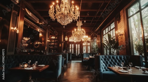 eatery, interior, design, luxury, opulent, dining, elegant, chic, modern, vintage, chandelier, lighting, seating, booth, table, chair, dark, wood, brick, window, plant, ambience, atmosphere, posh, sophisticated, glamourous, stylish, cosy, romantic, warm, inviting, food, drink, service, life events, decor, velvet, gold, crystal