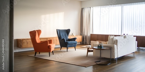 Orange and blue armchairs and white sofa against wooden cabinet. Scandinavian interior design of modern living room.