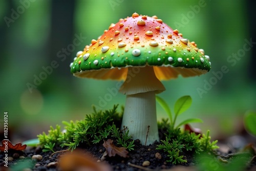 Orange and green mushroom cap with a veil breaking through, nature, opening