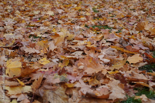 orange and yellow fallen maple leaves on green grass in autumn in nature park