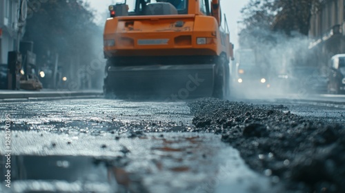 construction, machinery, paving, roadwork, asphalt, roller, vehicle, urban, street, repair, heavy equipment, surface, industry, transportation, maintenance, work, equipment, labor, technology, project, roadway, construction site, engineering, environmental, ground, material, modern, city landscape, pavement, dust, men at work, infrastructure, commercial, scenic, development, heavy machinery, landscape, noise, smoke, hard hat