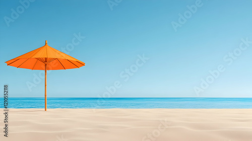 Orange beach umbrella on sandy shore, calm ocean background. Summer vacation postcard