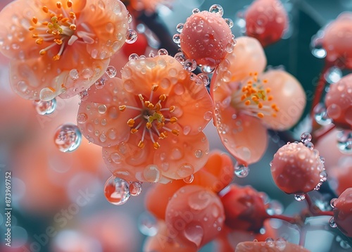 Orange blossoms with dew drops up close.