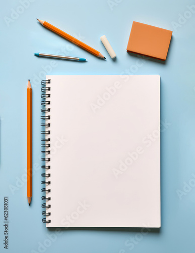 Orange blue flat lay office concept, notebook with copy space for message. Pencils and school supplies, it's time to go back to school. Illustration. Generative AI.