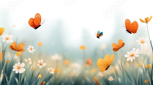 butterfly, flower, field, orange, nature, vibrant, serene, tranquil, beauty, colourful, delicate, flora, garden, peaceful, botanical, joyful, harmony, lively, playful, artistic, illustration, modern, contemporary, painted, animation, timeless, summer, meadow, landscape, energetic, scenery, animated, elegance, cheerful, bright, natural, flourishing