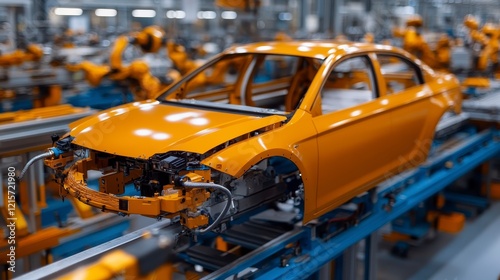 Orange car chassis on automated assembly line with robotic arms in a modern factory setting