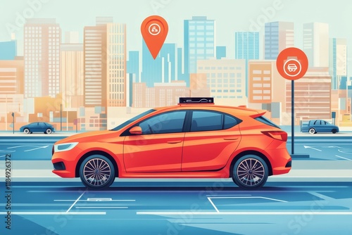 car, orange, city, city landscape, building, road, street, parking, location, pin, signs, vehicle, transportation, modern, urban, automobile, hatchback, roof, antennae, wheel, tire, daytime, sky, blue, driving, travel, infrastructure, design, graphic