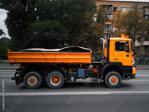 truck, orange, automobile, auto, car, cargo, drive, equipment, european, freight, garbage, heavy, highway, industrial, industry, kiev, machine, machinery, man, motion blur, motor, moving, public, reusing, recycling, road, service, street, transport, transportation, ukraine, urban, vehicle, washing, washing machine, waste, work