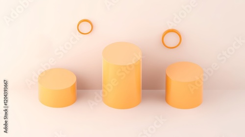 Orange Cylinders Minimalist Display - Three orange cylinders of varying heights and two smaller rings on a pale pink background. Minimalist product display.
