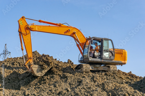 Orange excavator loads the land on a construction site..