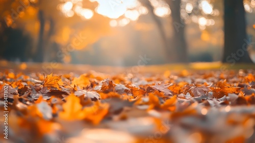 Orange fall leaves in park, autumn natural background