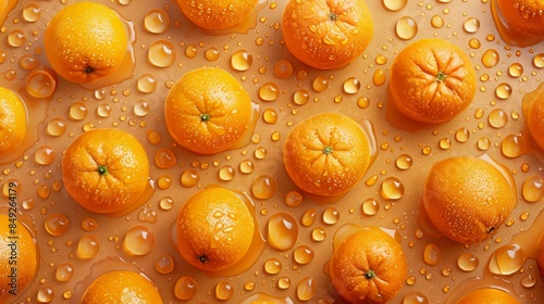 Orange fruits with water droplets on orange background.