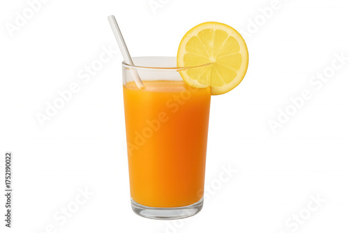 Orange juice in glass with lemon slice and straw, refreshing citrus drink, healthy beverage on transparent background