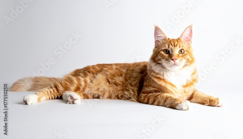 Orange Maine Coon Cat Lying Down on a White Background in Bright Daylight Showing Its Long Fluffy Tail and Fierce Eyes a Majestic Feline Portrait