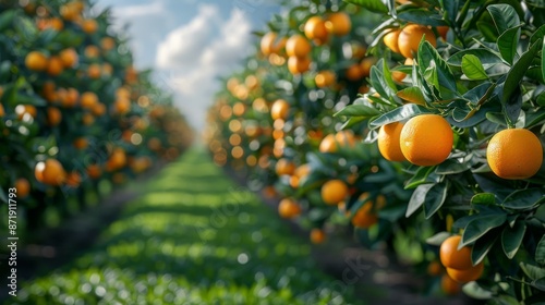 Orange plantation on sunny summer day. Landscape photo. Heathy fresh fruit. Vitamin. Orange grove harvest.