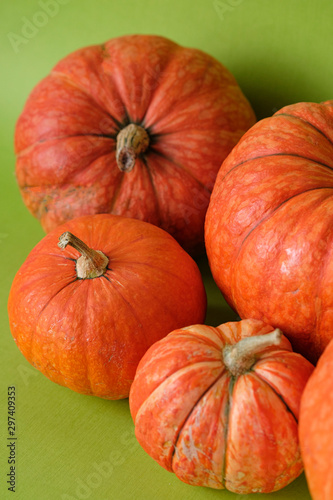Orange pumpkins on green background, holiday decoration, Selective focus. Fall autumn concept. Halloween, Thanksgiving, Harvest