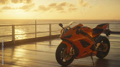 orange, motorcycle, sunset, pier, water, sky, cloud, horizon, gold, evening, dusk, wood, deck, railing, wheel, tire, brake, chain, fender, handlebar, headlamp, windscreen, sunshine, shadow, light, colours, beautiful, powerful, speed, design, transportation, freedom, adventure, travel, road, asphalt, fast, engine, chrome, metal, bright, glossy