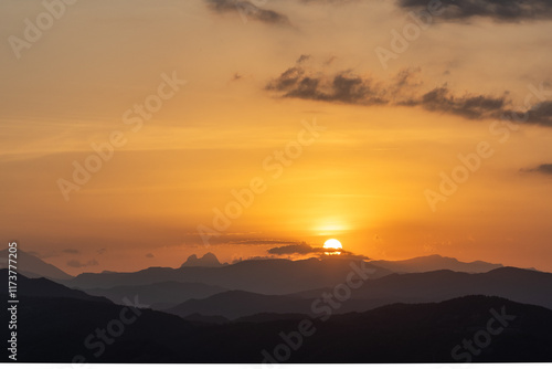 Orange sunset with the silhouette of the mountains