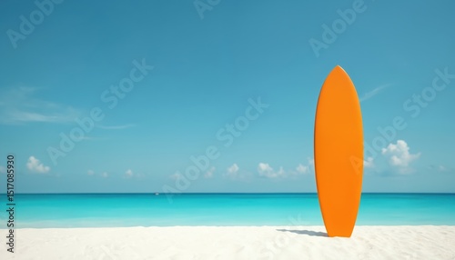Orange surfboard stands alone white sand beach, turquoise ocean water, blue sky. Summer holiday, tropical vacation, travel concept. Coastline background, sunny day. Surf equipment, surf culture,