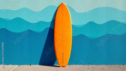 Orange surfboard stands centered against stylized blue waves, radiating beach energy, contrast, and visual clarity.
