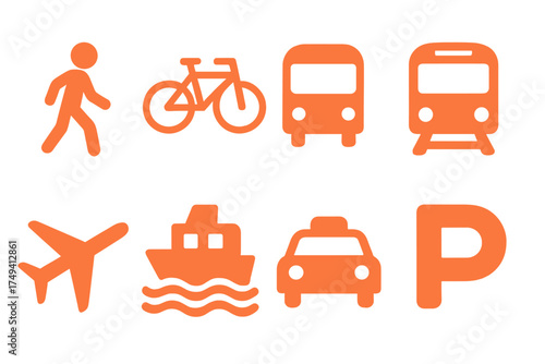 transportation, travel, icon, symbol, pedestrian, bicycle, bus, train, aeroplane, ship, taxi, parking, orange, mobility, navigation, map, interface, app, website, infographic, signage, communication, car, roadmap, simple