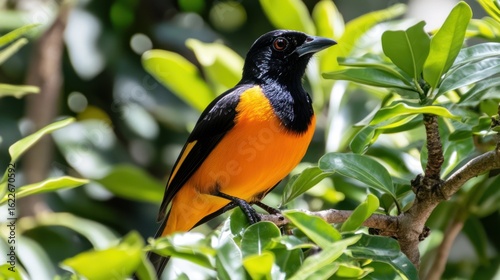 Orange-black bird perched on tree branch, lush green foliage in background. Ideal for nature photography