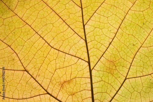 Orange-green fallen leaf with veins close-up. Autumn leaf texture