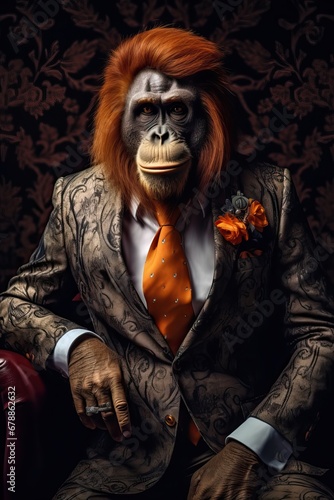 monkey, animal, orang, suit, portrait, leader, posh, dressed, gangster, confident, elegant, standing, executive, successful, powerful, gentleman, posing, sophisticated, businessman, charismatic, ambitious, fashion, character, style, expressive, boss, attaching, business, head, modern, human, detailed, attitude, photograph, shooting, look, body, bandit, hoodlum, mob, male, intense, orange, dramatic, photo, porcupine, illustration