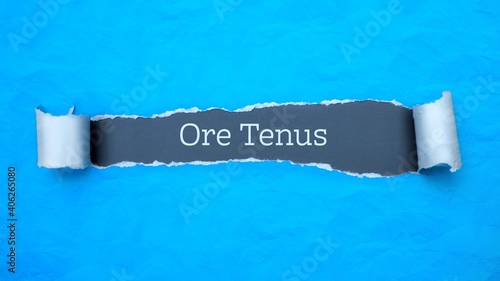 Ore Tenus. Blue torn paper banner with text label. Word in gray hole.